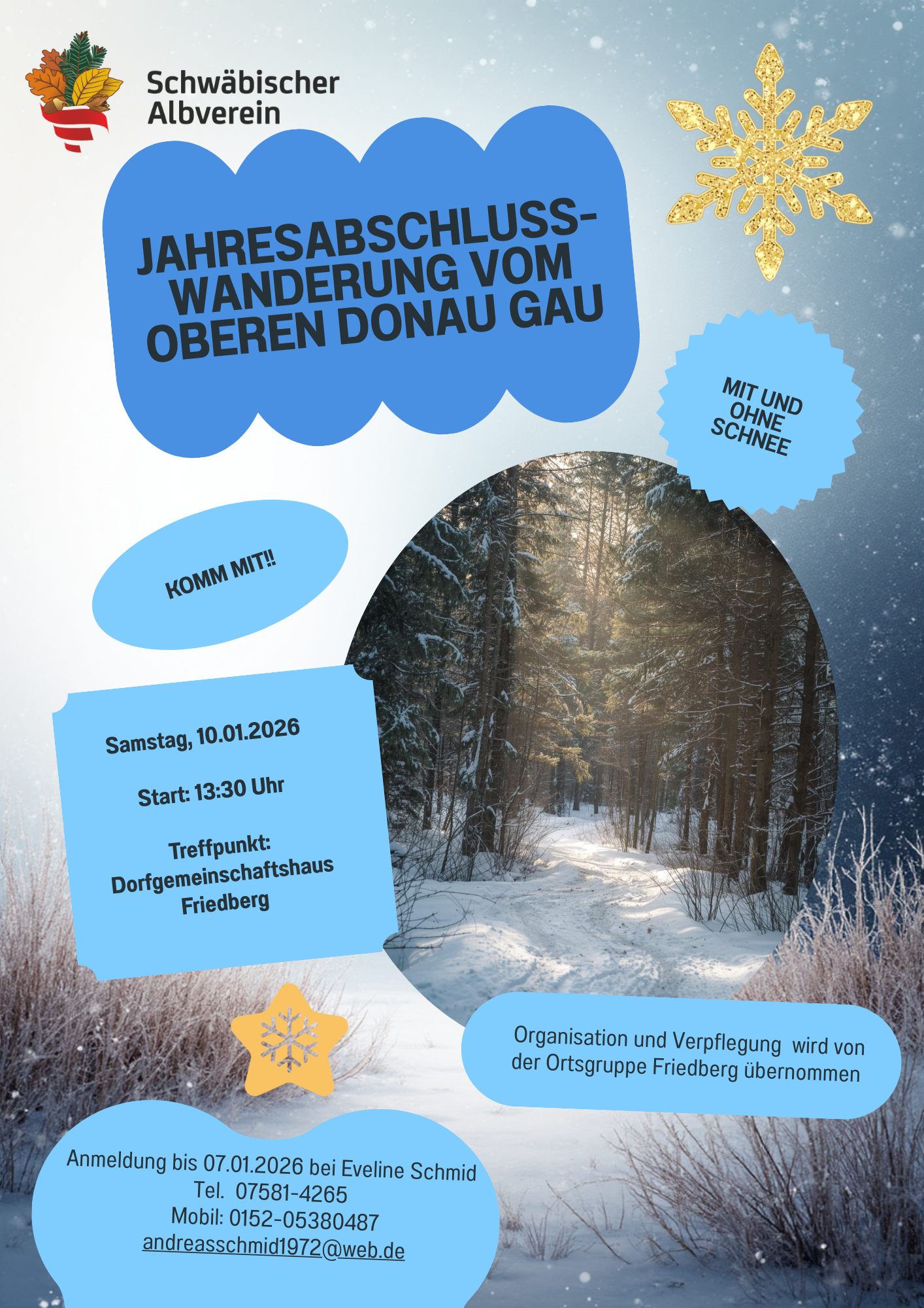 Am Samstag, 10.01.2026 findet in Friedberg die Jahresabschlusswanderung statt. Treffpunkt ist um 13:30 Uhr am Dorfgemeinschaftshaus in Friedberg.